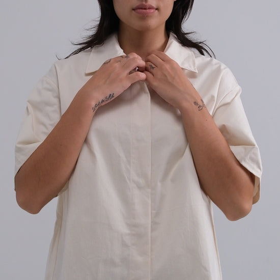 A boxy-fit tee with oversized sleeves, featuring our signature metal snap button detail. Designed for a clean, contemporary look, the snap buttons remain hidden when fully closed. Made from 100% cotton, structured yet soft for all-day comfort